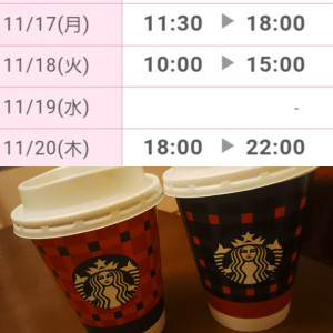 今週のシフトです⭐ 2025/11/17 08:28:58 おはようございます!!ゆうです!!!今週も始まりました!!今年もあと1ヶ月半切ってる💦早い💦今週のシフトです🩷今日は11時半~18時までいるのでいつでも遊びに来てください♡ この前夜スタバしたときの☕クリスマスカップかわいい💗ホット飲むときはショートサイズです😊ではまたね👋😃