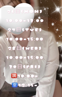 次週出勤予定です♡ 2026/01/23 20:42:19 こんばんは〜🌙* :゚来週の出勤予定決まりました♡ 早速の事前予約ありがとうございます🥰 まだご案内できる日時ございますので お気軽にお問い合わせくださいませ🍀.*明日は12:00よりパラディでお待ちしてます🌟